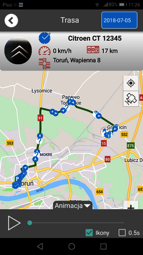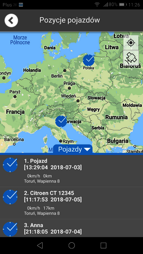 Dzięki aplikacji możesz obserwować gdzie znajdują się pojazdy, czy w danym momencie przemieszczają się, czy są po prostu zaparkowane. Czytelna lista i ikonki w prosty sposób informują o tym, co aktualnie dzieje się z pojazdem. Za pomocą funkcji wyświetlisz pozycję wszystkich lub pojedyńczego obiektu na mapie. Możesz również prześledzić aktualną trasę lub cofnąć się do 90 dni wstecz.